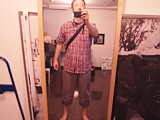 三田方面に赤いチェック柄シャツ、たすき掛けカバン、七分丈パンツで行くと、