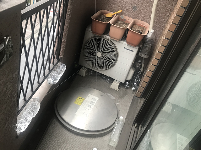 室外機の裏で巣作りをしたいらしいのだが、裏へ回れないように置いておいた空っぽのペットボトルを、鳥ごときが、なにをどうやったのか上手にずらしてどかし、今朝、裏に入り込んでいてびっくりした。